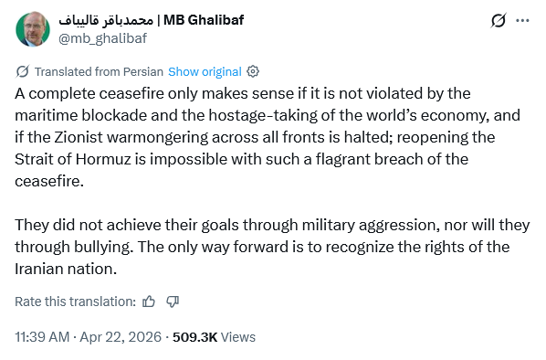 Yet at least publicly, Iran seems unaware of its role in this. Instead, the current leadership atop the regime of Supreme Leader Mojtaba Khamenei, including Parliament Speaker Mohammed Bagher Ghalibaf, fatuously point a finger of blame at the United States, such as Ghalibaf did with his usual bellicosity yesterday.