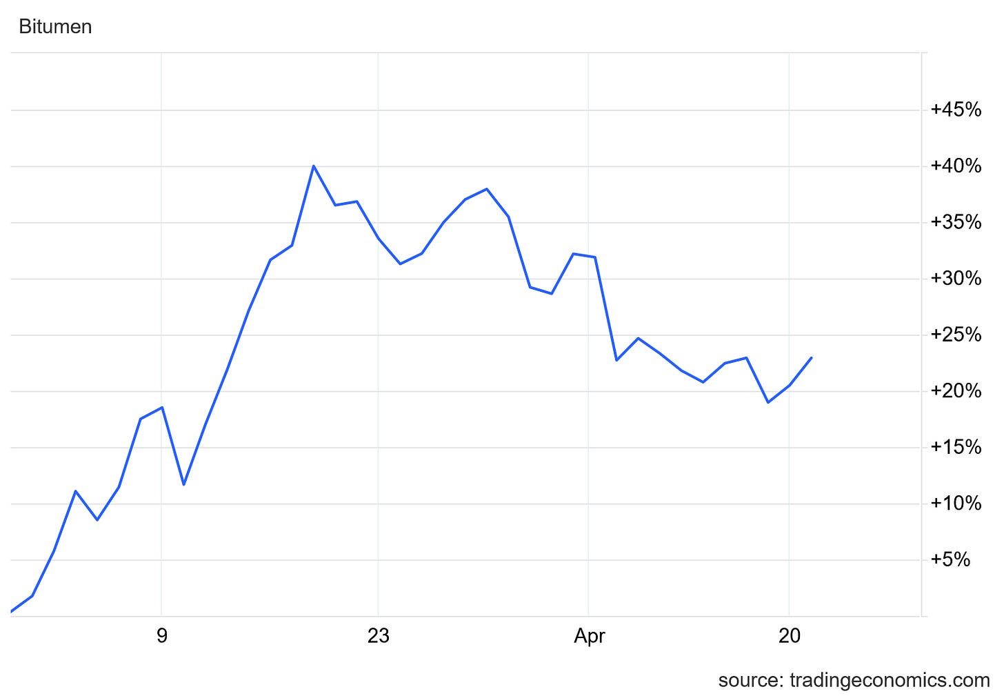 Bitumen is currently sitting at just under a 25% increase, after touching 40% towards the end of March.