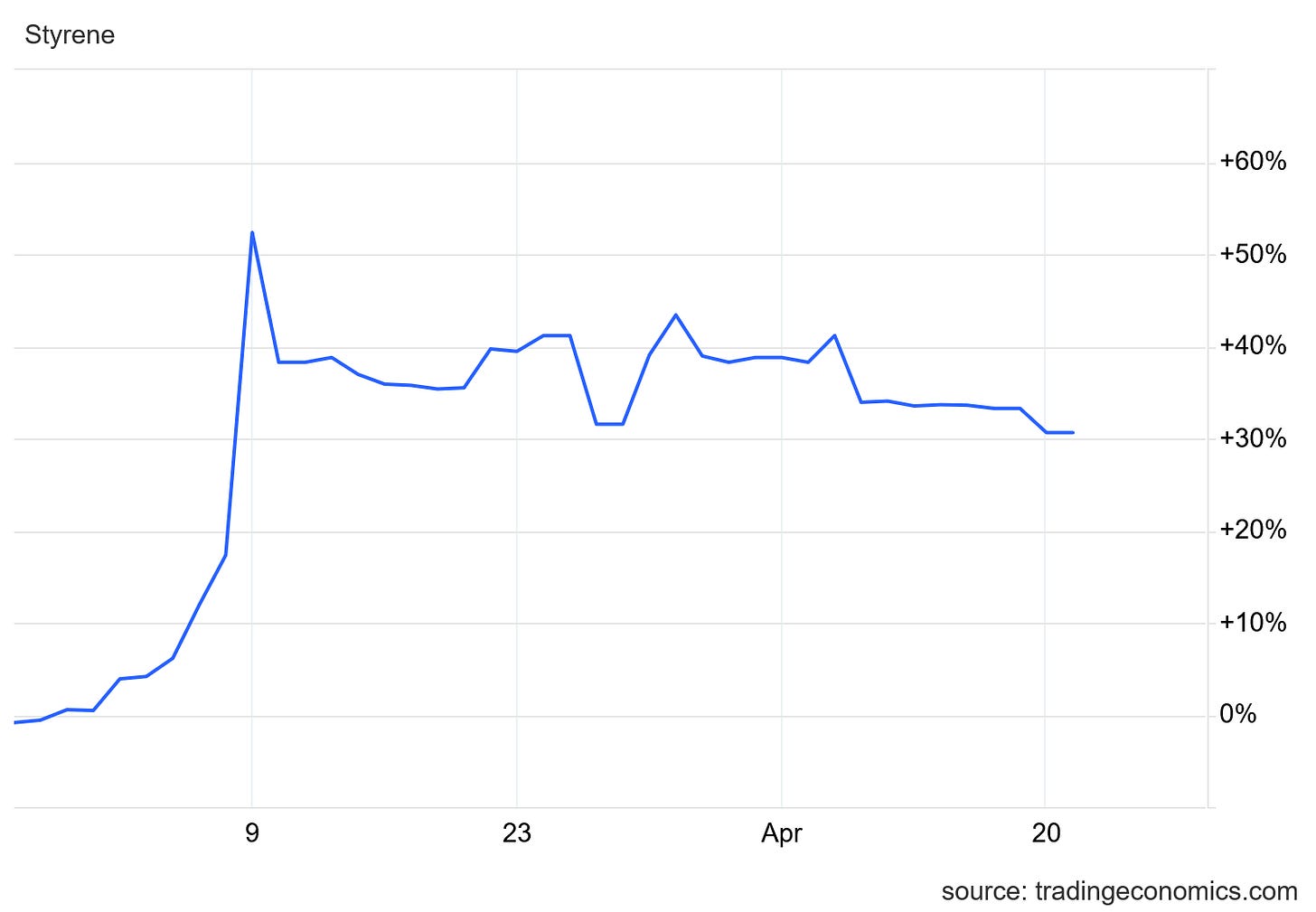 Styrene has risen some 30% since the war began, and initially had surged by just over 50%.