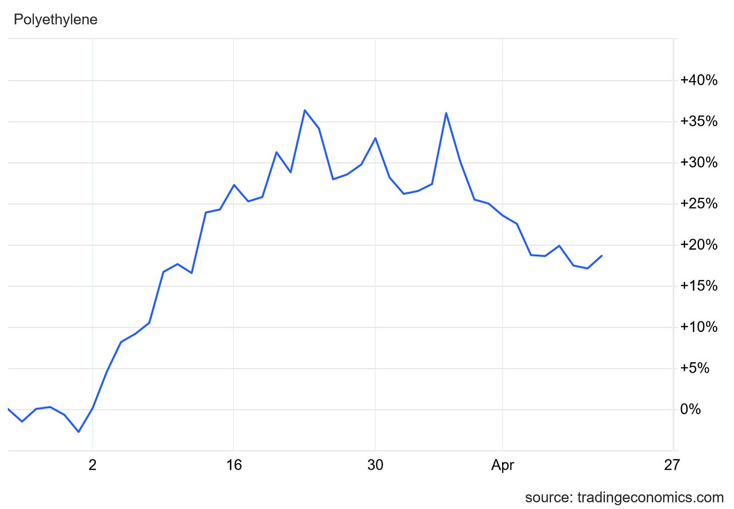 Polyethylene prices have surged nearly 20% since the war began, and at one point flirted with a 40% increase.