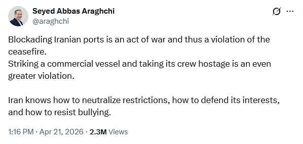 Iran accusing the US of “warmongering” in the Strait is, of course, absurd. The US is not the nation that told ships they could enter the Strait, only to fire on them. That was something Iran did on April 18.