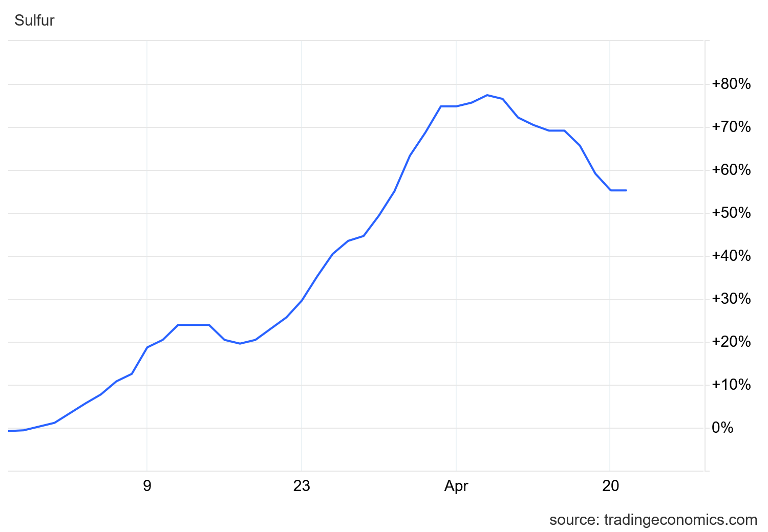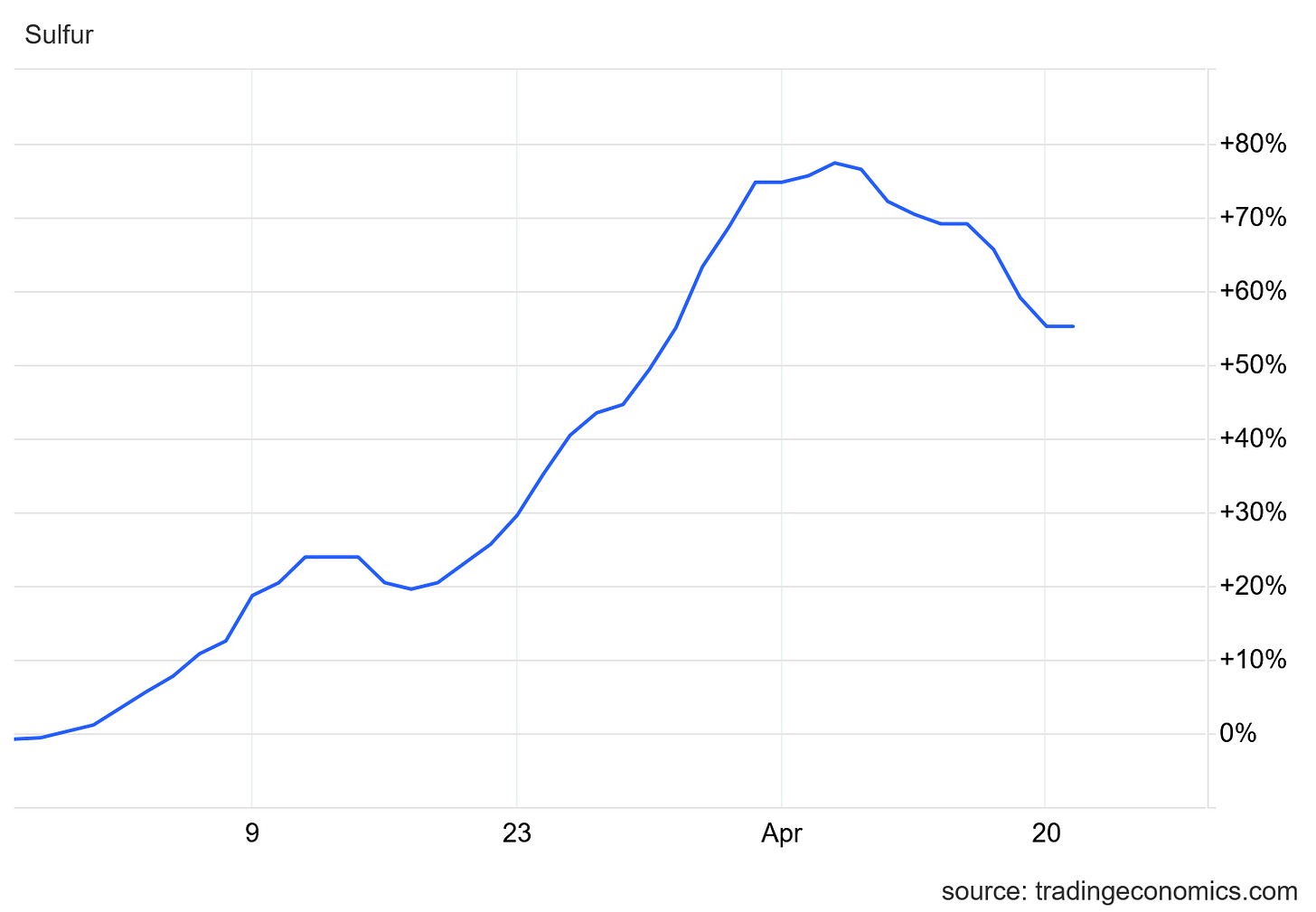 While sulfur prices have come down some for China, relative to pre-war pricing China is still paying 55% more than before.