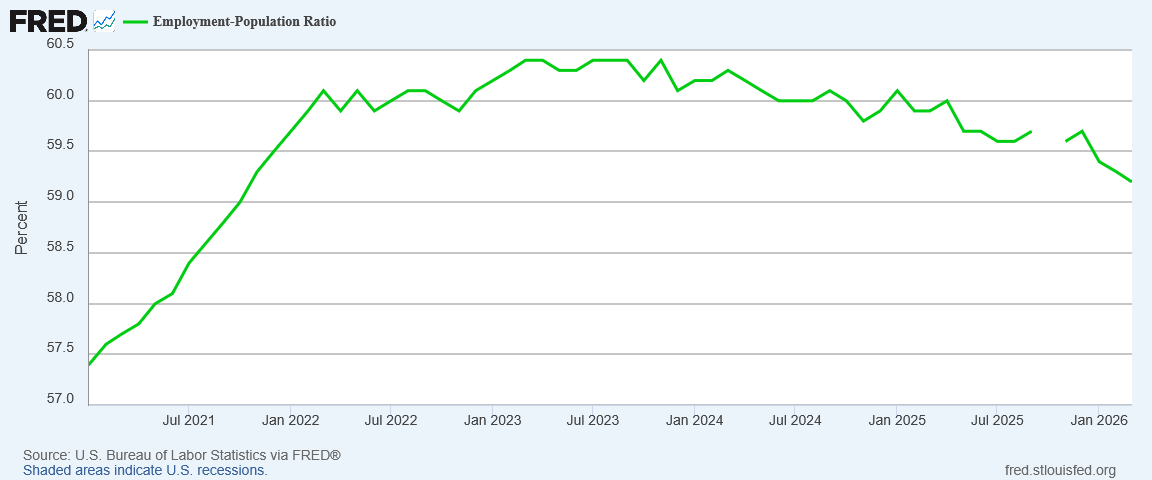 The Employment-Population Ratio, also from the Current Population Survey, has been declining since 2023.
