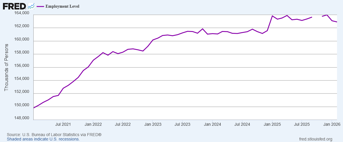 The Employment Level from the Current Population Survey (Household Survey) portion of the jobs report shows that employment peaked in this country at the start of 2025 and has trend down since.