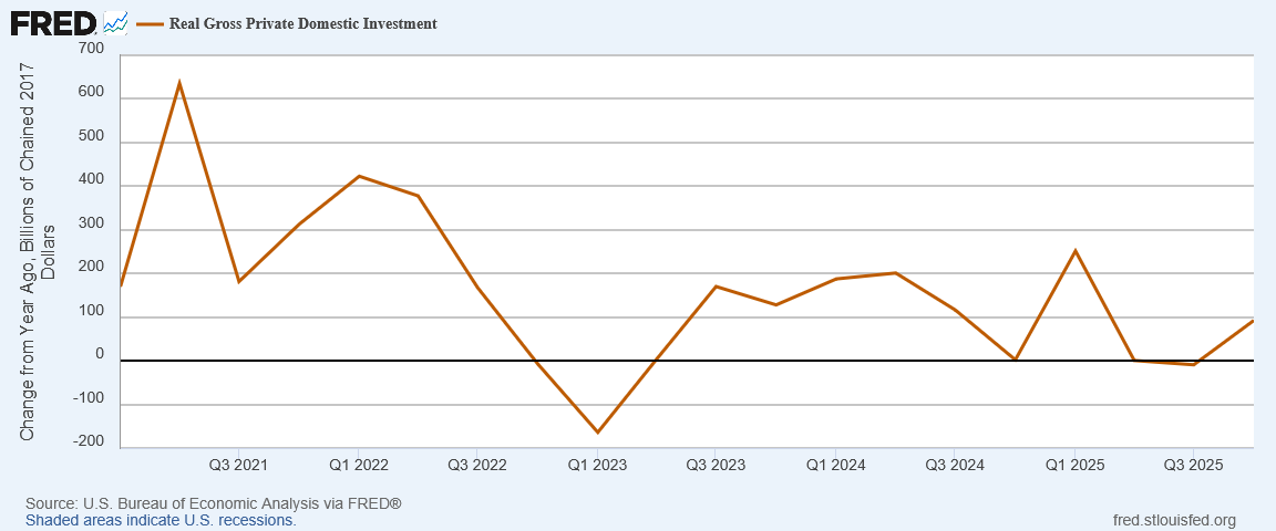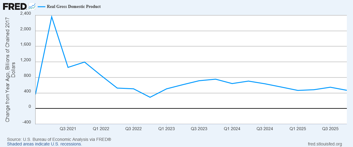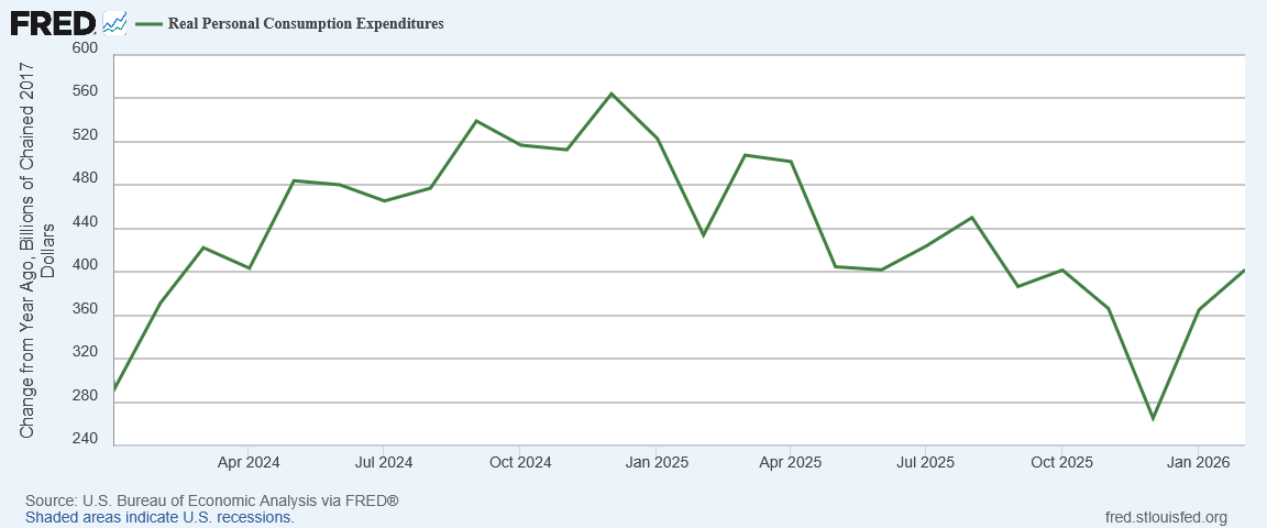 We demonstrably have year on year growth in Real Personal Consumption Expenditures that has been trending down since the start of 2025, although there are signs that trend may be reversing in 2026.