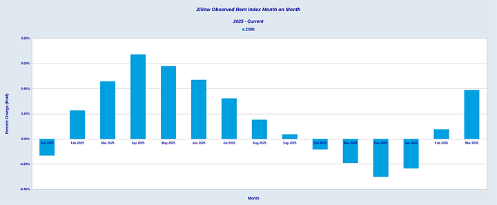 Intriguingly, shelter price inflation also rose, with the more conservative BLS subindex printing 0.3% month on month and the more forward-looking ZORI index printing close to 0.4% month on month.
