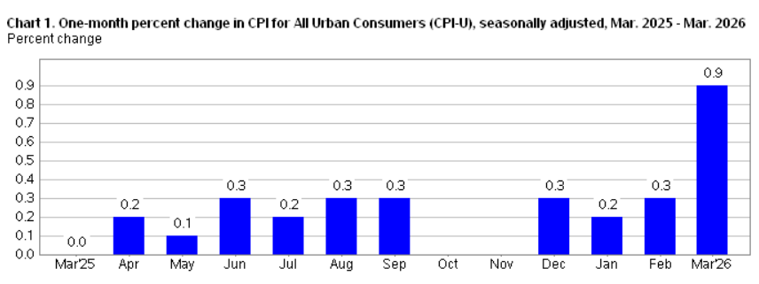 The Consumer Price Index for All Urban Consumers (CPI-U) increased 0.9 percent on a seasonally adjusted basis in March, after rising 0.3 percent in February, the U.S. Bureau of Labor Statistics reported today. Over the last 12 months, the all items index increased 3.3 percent before seasonal adjustment.