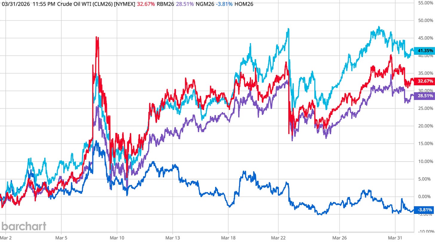 As we would expect from a surge of that magnitude, it was an across-the-board increase: Crude oil, diesel, and reformulated gasoline all soared in March.