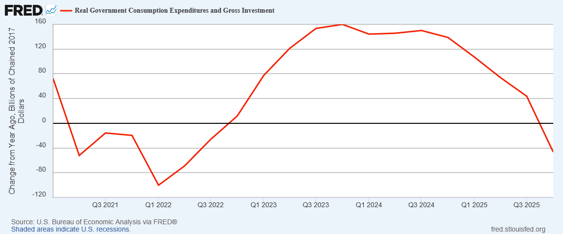 We demonstrably have what many will receive as good news, year on year real growth in government spending that has trended down since the end of 2024 and turned negative at the end of 2025.