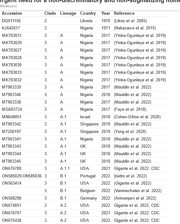 In describing their proposed taxonomic naming conventions for monkeypox, they presented the following list of monkeypox genomes: