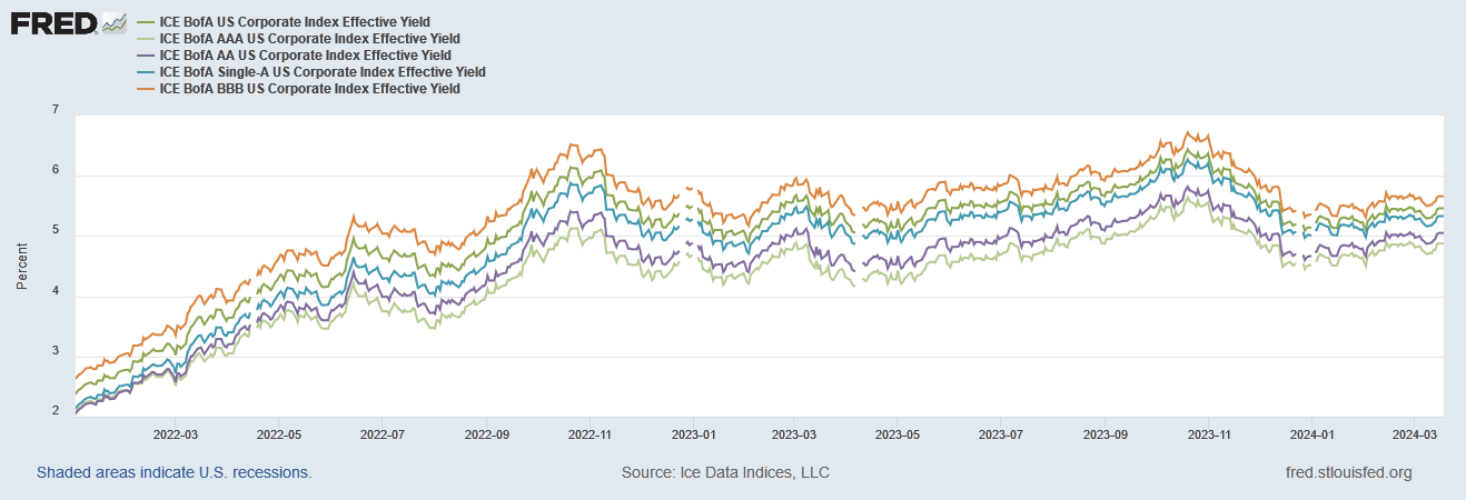 Corporate yields on investment grade debt have largely followed the same overall trends as Treasury yields: