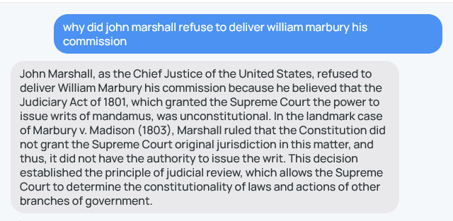 Ironically, objections by many modern scholars and activists against any honoring of John Marshall revolves almost entirely around his status as a slaveowner, ignoring his arguably questionable ethics in hearing Marbury. Most recitations of the facts surrounding Marbury v Madison completely whitewash Marshall’s pivotal role in creating the legal matter at hand, noting only that Marbury’s commission was not delivered6. Even Google’s Gemini AI ChatBot is blissfully unaware of the ethical dilemma.