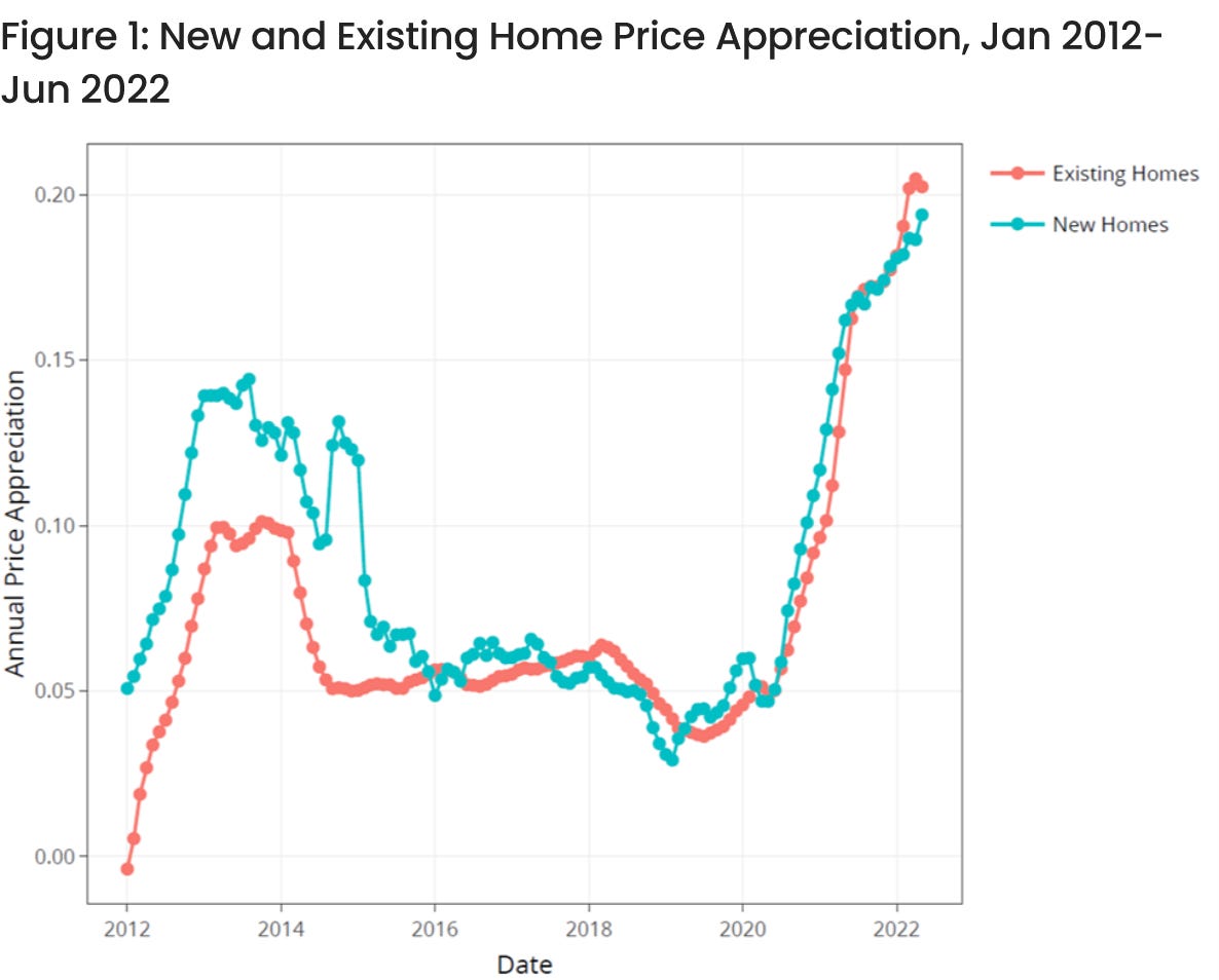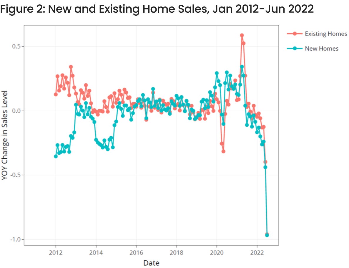 Home sales follow a volume cycle rather than a price cycle, and this phenomenon is exaggerated for new homes. When demand dries up, developers prefer to delay projects and wait out the downturn. Homes that developers do sell during these periods are the ones for which they can still command a high price. Since few people are willing to pay the same price with higher interest rates, prices remain the same and sales go down.