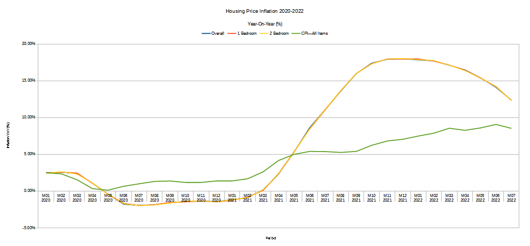 At 12.3% year-on-year, July’s rent inflation, although cooler than June’s figure, was still nearly 4 percentage points higher than headline consumer price inflation, having peaked at the end of 2021 at over 11% higher.