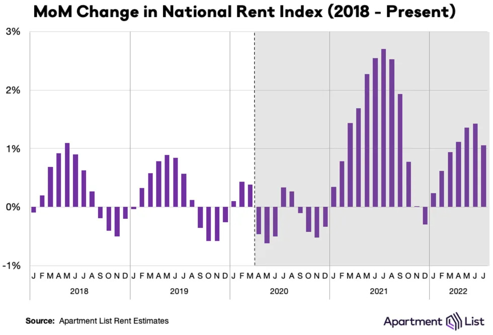 Not only are housing prices in the stratosphere, so too are rents, with several markets seeing record increases in apartment rental rates since the start of 2021. So dramatic have the rent hikes been that, as measured by The Apartment List’s National Rent Index, the July increase of 1.1% month-on-month represents a decline to less than half of the month-on-month increase of 2.9% in July, 2021.