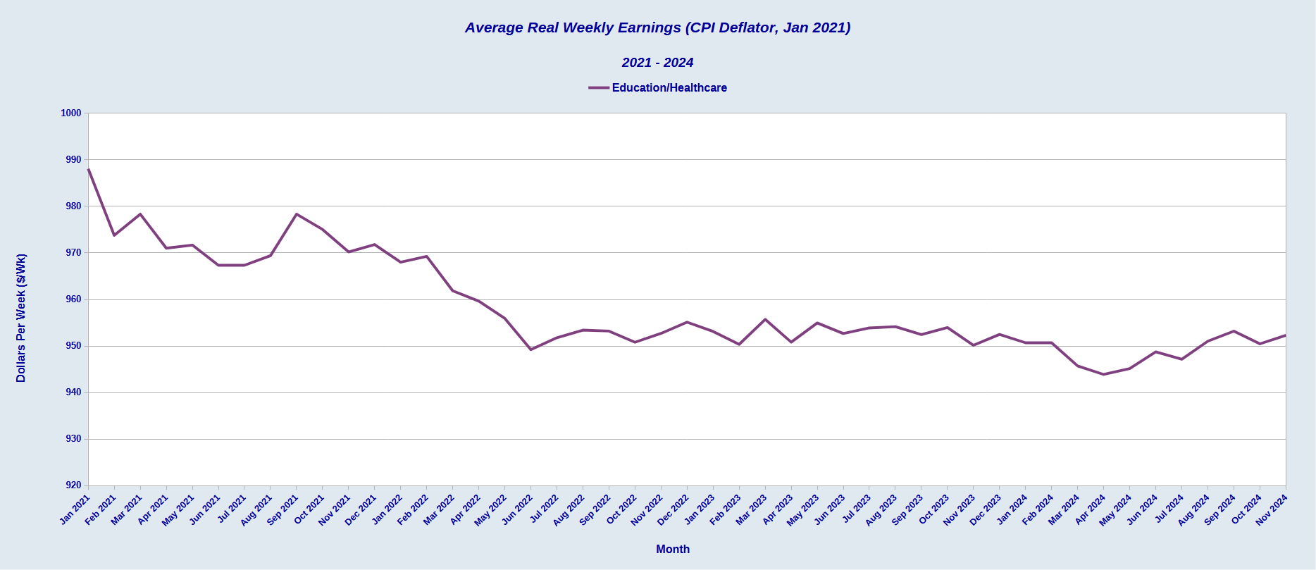 Even in the Education and Healthcare sectors, real wages declined as job openings surpluses rose.
