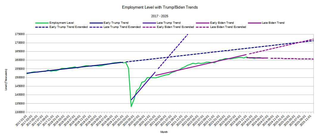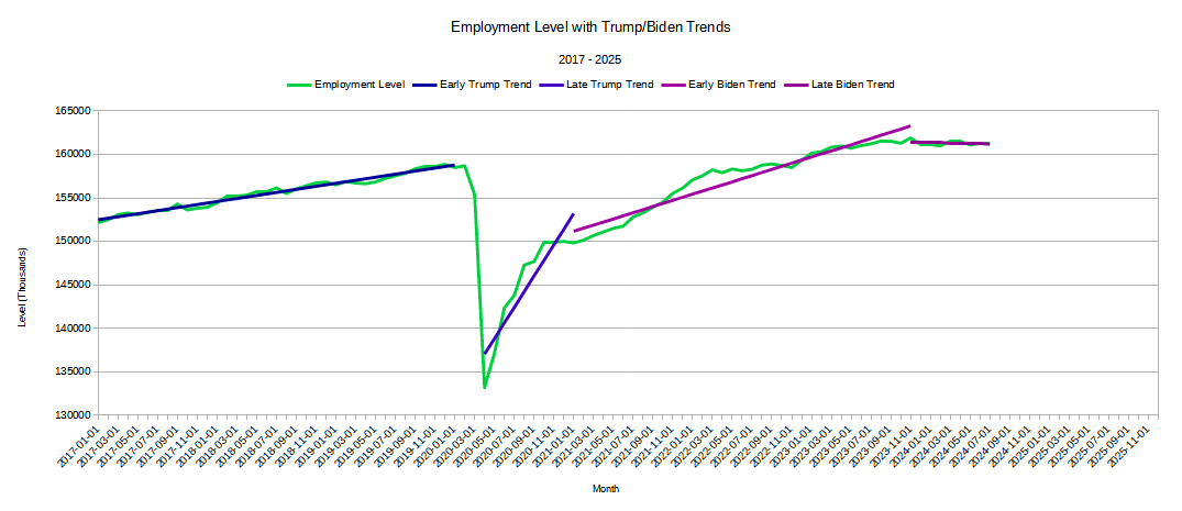 The late Biden trend, however, is where we see definite problems—this is a negative trend. Employment has been decreasing in this country since late last year, and the data shows that.