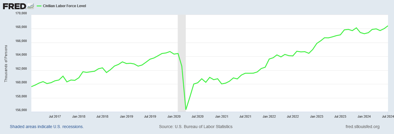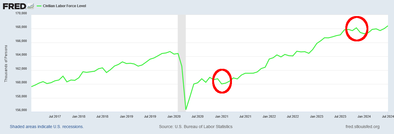However, when the Biden-Harris dynamic duo took office, the trend shifted down. The labor force continued to grow, but at a significantly slower rate.