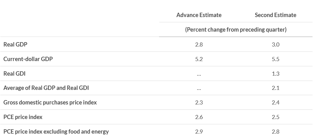 Real gross domestic product (GDP) increased at an annual rate of 3.0 percent in the second quarter of 2024 (table 1), according to the "second" estimate released by the U.S. Bureau of Economic Analysis. In the first quarter, real GDP increased 1.4 percent.