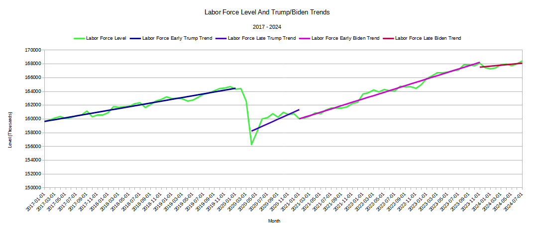 During the Trump Administration pre-COVID, the trend was one of fairly steady growth within the labor force. The COVID Pandemic and associated lockdowns naturally threw growth trends for a loop, but by the time the 2020 recession ended labor force growth under Trump resumed at a predictably faster rate than pre-COVID.