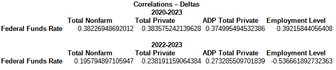 When we look at the correlation coefficients2, we see that the only inverse correlation is a somewhat weak relationship between the federal funds rate and the Employment Level from the Household Survey, and only when we look at the deltas, or changes, in the data from 2022 and 2023.