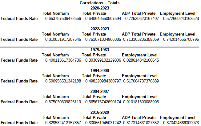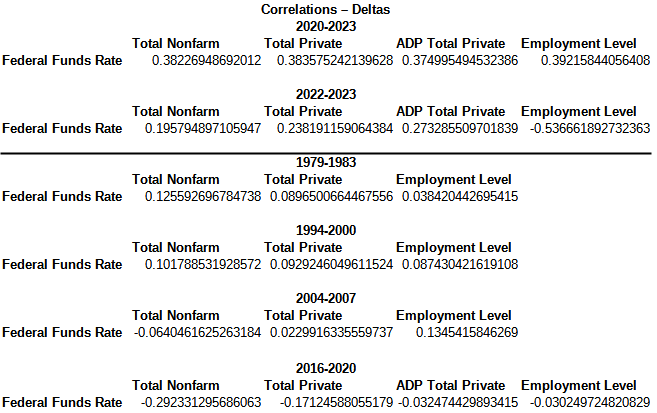 If we look at the correlations between employment levels and the federal funds rate itself during these same intervals, we see somewhat stronger positive correlations—but no inverse correlations.