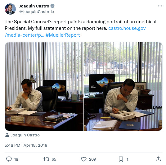 To be sure, Democrats are outraged that Mueller failed to crucify Donald Trump, and even more outraged that Attorney General Barr failed to spin Mueller's report into a crucifixion of Donald Trump. During and after Barr's morning press conference, several took to Twitter to pontificate and bloviate some more: