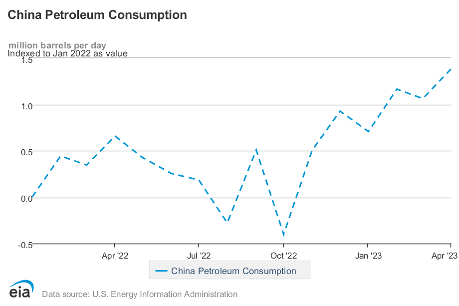 However, contrary to the forecasts from January, we also have not been seeing rising demand. According to IEA estimates, total world oil demand peaked in the third quarter of 2022 at 100.7 million bbl/d, and dropped to 99.6 million bbl/d for the first quarter of 2023—a demand decline of over 1 million barrels per day.