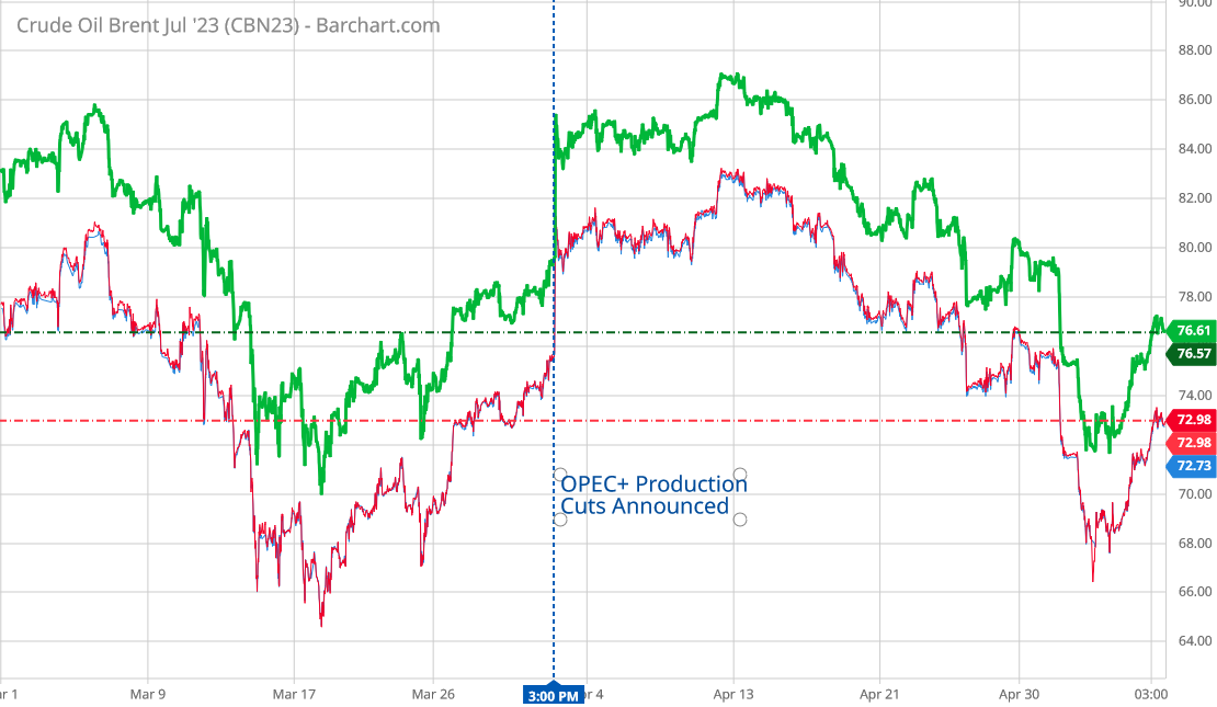 When Saudi Arabia announced the production cuts on April 2nd, Brent Crude was priced at around $79.47/bbl, and West Texas Intermediate was priced around $75.57/bbl. Even factoring in last week’s recovery in oil prices, Brent Crude and WTI are both approximately $3/bbl below the price in place immediately prior to the production cut announcement.