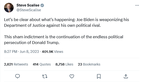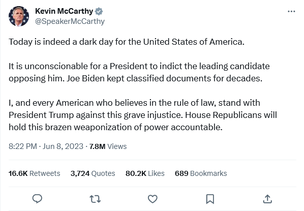 Among Democrats, President Biden’s handlers showed uncharacteristic restraint and have not tweeted about the indictment as of this writing.
