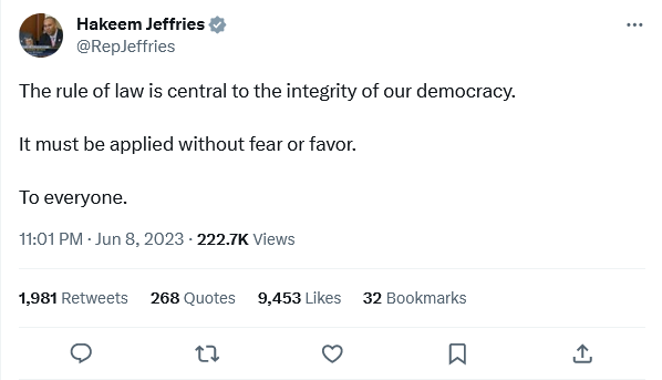 House Minority Leader Hakeem Jeffries issued a fairly anodyne tweet about the rule of law.
