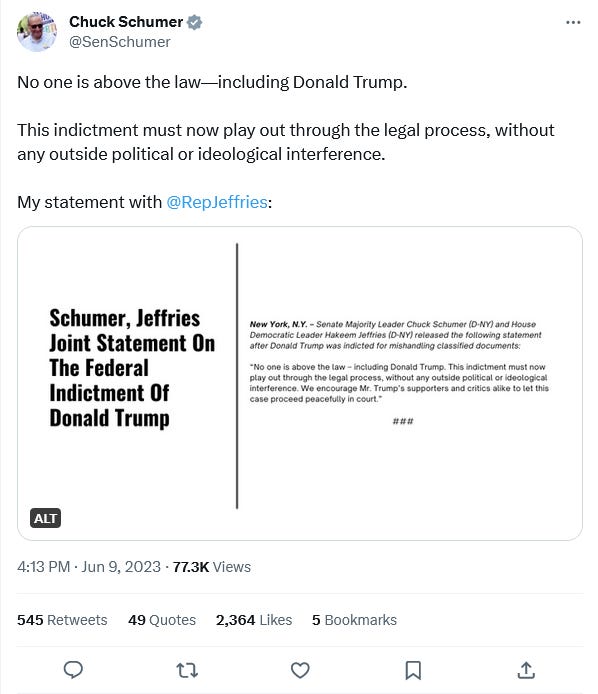 The investigation into the handling of those documents is ongoing. However, given this indictment of Donald Trump, one has to wonder if the President should also not be indicted on substantially the same charges. Following Congressman Jeffries tweeted position that the law must be applied “without fear or favor”, such an indictment would be almost mandatory.Former Vice President Mike Pence was recently cleared by the FBI of any wrongdoing—at least, he will not be criminally charge with any wrongdoing—after having been found in possession of classified materials at his Indiana home.