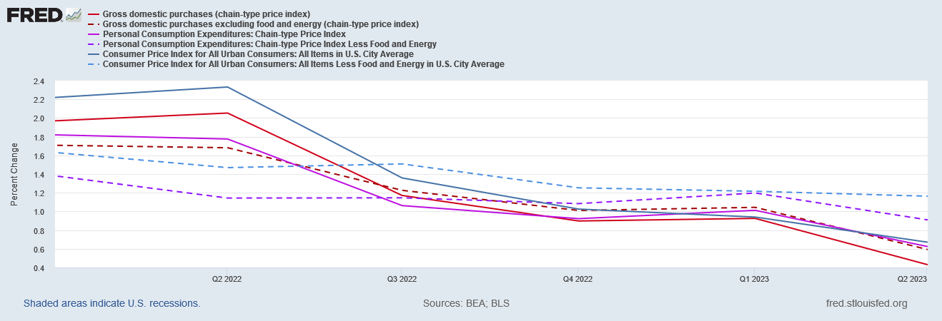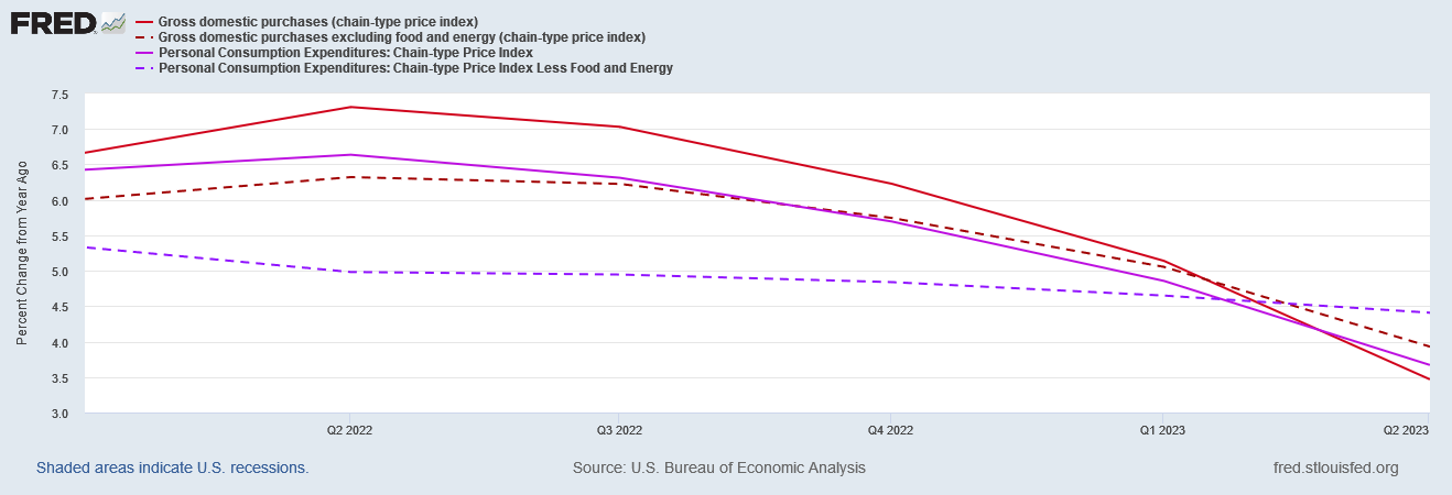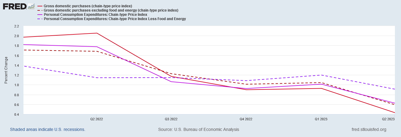 The Gross Domestic Purchase Price Index inflation rate in 2022 was higher than the PCEPI, but in 2023 has slipped below the PCEPI. Even with comparing the two indices less food and energy we see the same tendency.
