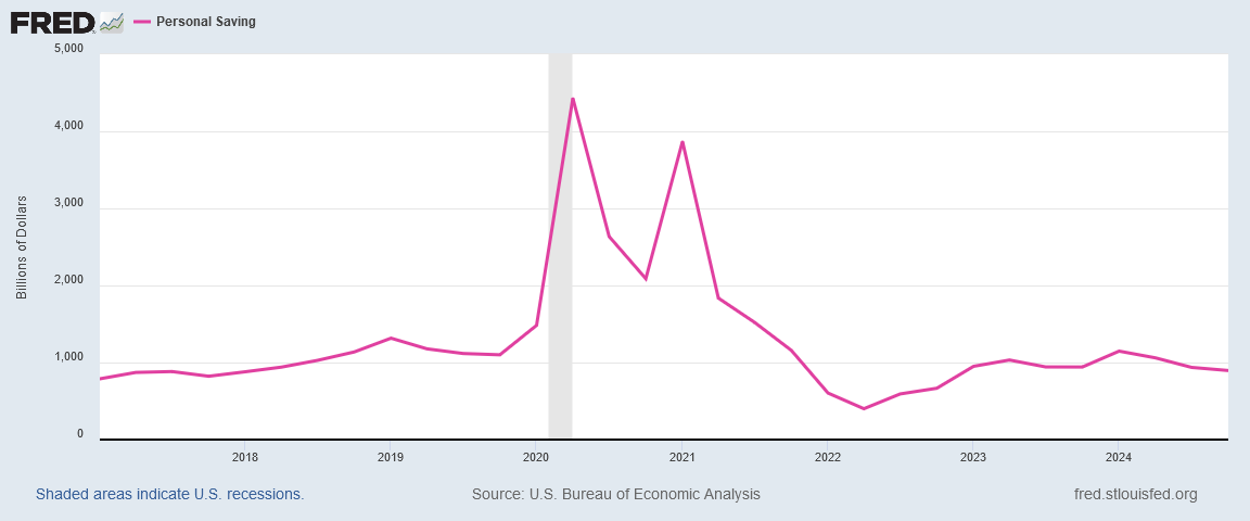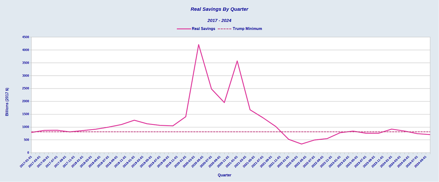 After the dislocations of the COVID Pandemic Panic were digested in 2020-2021, real savings during the (Biden-)Harris years rarely reached as high as the lowest savings figures for Trump’s first term pre-COVID.