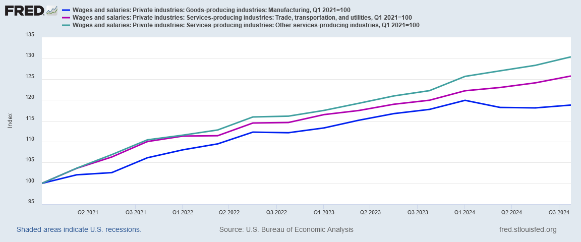 Since 2021, however, manufacturing wage growth has been dead last from the start.