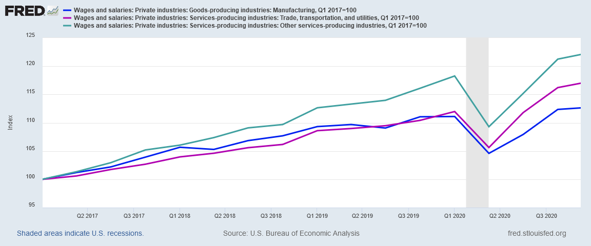 During the Trump years pre-COVID, manufacturing wages and wages in trade, transportation, and utilities fared better.