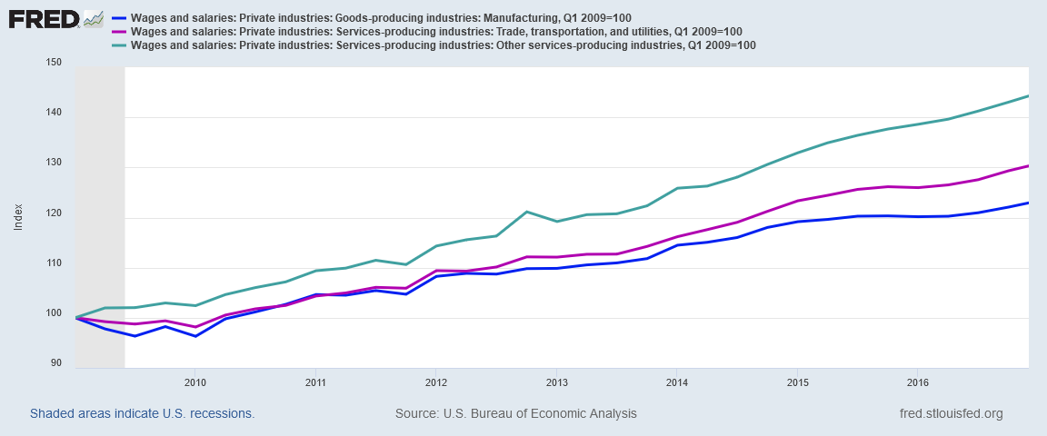 During the Obama years, manufacturing wages and wages in trade, transportation, and utilities very nearly kept pace with each other, even as other services outpaced them both.