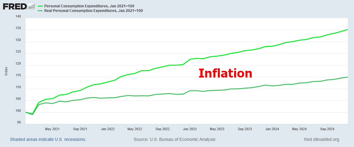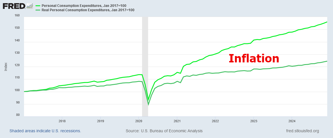 The difference between nominal and real personal consumption expenditures is the impact inflation has had on prices.