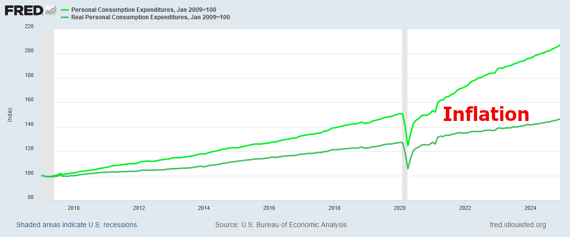 They do not pause to consider the extreme disparity between nominal consumption levels and real consumption levels—with the difference between the two being the impact of consumer price inflation.