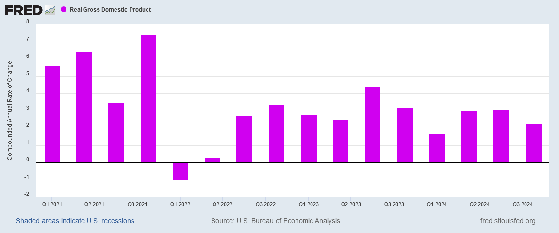 Real gross domestic product (GDP) increased at an annual rate of 2.3 percent in the fourth quarter of 2024 (October, November, and December), according to the advance estimate released by the U.S. Bureau of Economic Analysis. In the third quarter, real GDP increased 3.1 percent.
