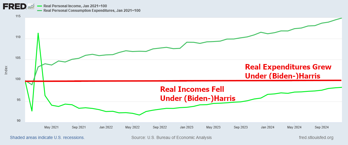 The overall trend for the (Biden-)Harris Administration is one of declining real personal income in this country coupled with rising real personal consumption expenditures. That’s not a good trend.