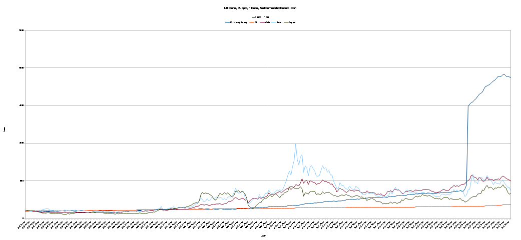 Commodity prices fluctuate wildly at all money supply levels, and, most tellingly, we do not see in 2020 an explosion in commodity prices to match the explosion in the M1 money supply when the Federal Reserve injected huge amounts of liquidity into the financial system to stave off potential systemic ruptures and dislocations as the country went through the bizarre and destructive social experiment of shutting the country down.