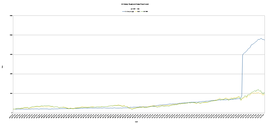 2008 is an intriguing year, economically speaking, because while the consumer price index became unmoored from the M1, asset prices (as measured by the Dow Jones Industrial Average and the S&P 500 stock indices) began to follow the M1 trajectory far more closely than before.