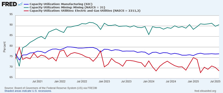 Across multiple sectors, capacity utilization in the US economy has either been stagnant or trended down.