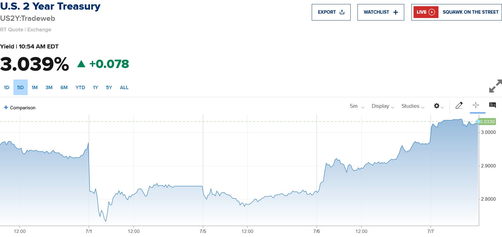 While the yield on 10-Year Treasury Bonds continues to climb, not only is it not surpassing the yield on 2-Year Treasuries, but even the 5-Year Treasuries are posting higher yields.