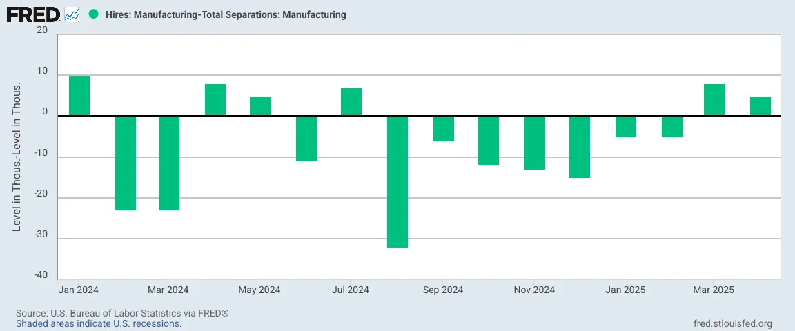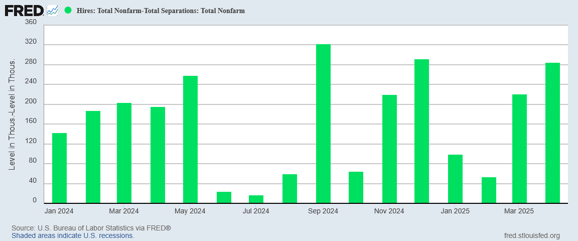 Despite the Bureau of Labor Statistics’ penchant for anodyne phrasing, the numbers within the JOLTS data set are clear: they show net hiring up in April.