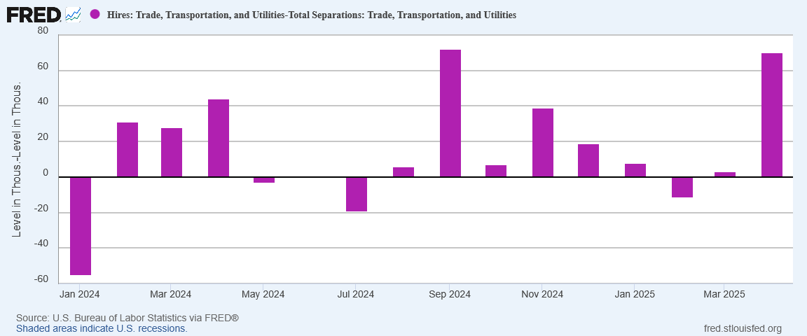 We especially need to remember that skepticism when we look at the separations data. April saw a continuation of the separations trend of rising layoffs coupled with falling quits.