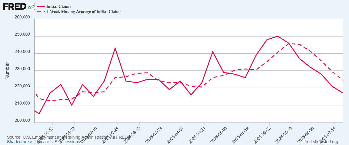 In the week ending July 19, the advance figure for seasonally adjusted initial claims was 217,000, a decrease of 4,000 from the previous week's unrevised level of 221,000. The 4-week moving average was 224,500, a decrease of 5,000 from the previous week's unrevised average of 229,500.