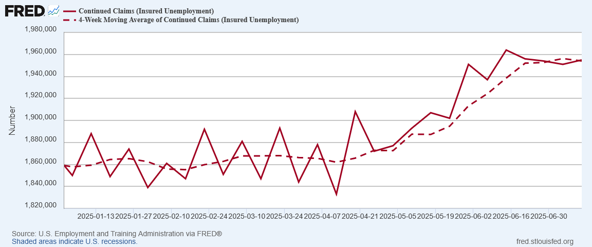 The advance seasonally adjusted insured unemployment rate was 1.3 percent for the week ending July 12, unchanged from the previous week's unrevised rate. The advance number for seasonally adjusted insured unemployment during the week ending July 12 was 1,955,000, an increase of 4,000 from the previous week's revised level. The previous week's level was revised down by 5,000 from 1,956,000 to 1,951,000. The 4-week moving average was 1,954,000, a decrease of 2,250 from the previous week's revised average. The previous week's average was revised down by 1,250 from 1,957,500 to 1,956,250.