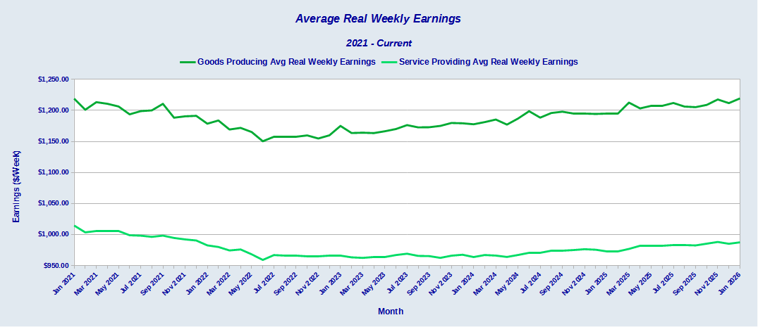 Between January 2025 and January 2026, average real weekly earnings for goods producing jobs rose $24.84.